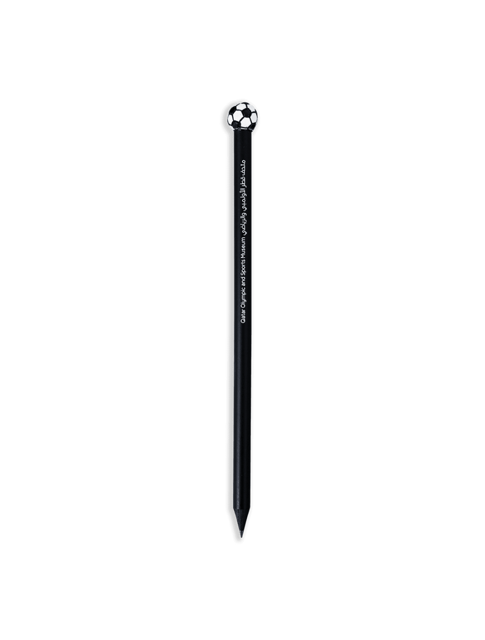 A 3-2-1 Qatar Olympic and Sports Museum branded pencil with a football affixed to its end.